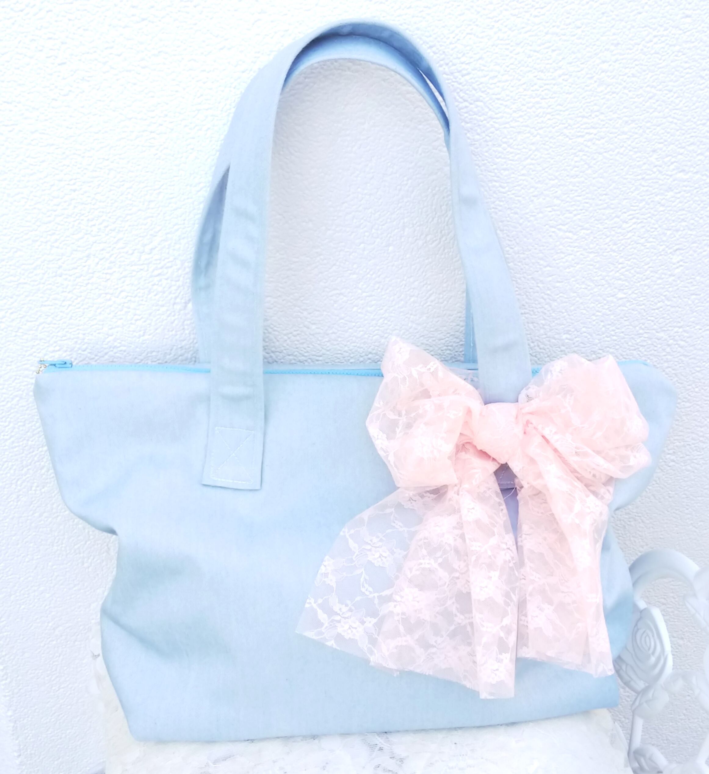 デニム風のコットン生地にレースの大きなリボンを結びました。